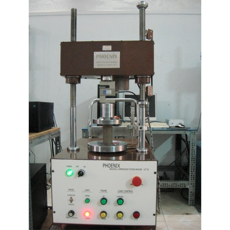 - Hệ thống gia tải trục vít, cấp tải tối đa: 50kN (5 Tf). Kích thước khung (l x w x h): 345 x 580 x 1100mm. Khoảng cách giữa 2 cột: 280mm. Khoảng cách tối đa giữa đầu nén và bàn nén: 500mm (có thể thay đổi cho phù hợp mà không báo trước, tuy nhiên, đảm bảo kích thước mẫu nén đường kính đến 150mm)